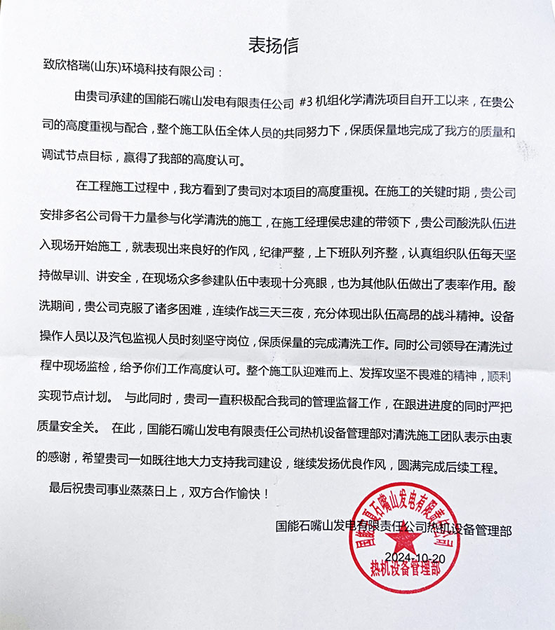 國能石嘴山發(fā)電有限責(zé)任公司的表揚信,對欣格瑞公司的施工團(tuán)隊給予了高度評價:“貴公司酸洗隊伍表現(xiàn)出來良好的作風(fēng),紀(jì)律嚴(yán)整,上下班隊列齊整,認(rèn)真組織隊伍每天堅持做早訓(xùn)、講安全,在現(xiàn)場眾多參建隊伍中表現(xiàn)十分亮眼,也為其他隊伍做出了表率作用。酸洗期間,貴公司克服了諸多困難,連續(xù)作戰(zhàn)三天三夜,充分體現(xiàn)出隊伍高昂的戰(zhàn)斗精神。公司領(lǐng)導(dǎo)在清洗過程中現(xiàn)場監(jiān)檢,給予你們工作高度認(rèn)可。在此,國能石嘴山發(fā)電有限責(zé)任公司熱機(jī)設(shè)備管理部對清洗施工團(tuán)隊表示由衷的感謝!”