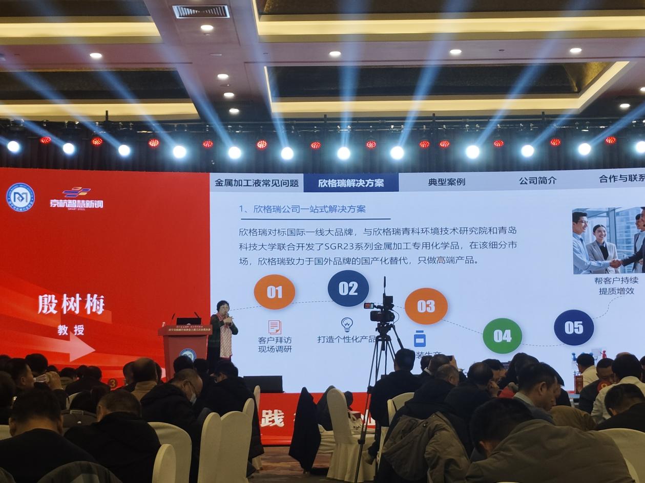 作為本次大會協辦單位,欣格瑞公司高級顧問殷樹梅應邀對欣格瑞金屬加工液一站式解決方案進行重點推介,她首先剖析了金屬加工液選擇不當的常見問題及其根源,并據此推出欣格瑞全方位解決方案,該方案對標國際一線品牌,由欣格瑞青科環境技術研究院與青島科技大學聯合研發推出,能極大地在機械加工過程中提質增效。在細分市場中,欣格瑞矢志不渝地推進國外品牌的國產化替代,專注于高端產品的打造。公司產品體系完備,囊括了全合成切削液、半合成切削液、微乳化切削液,以及清洗劑、防銹劑、鈍化劑等配套產品,能夠充分滿足黑色金屬、有色金屬在車、磨、銑、鏜、鉆等工藝環節中的嚴格要求,以及后續工件的防銹、清洗、鈍化處理需求,在多個典型案例中展現出卓越的性能。同時,公司具備強大的自主研發創新能力,目前已有兩項金屬加工液發明專利進入實審階段。與會人員對欣格瑞公司金屬加工液一站式解決方案表示了濃厚的興趣,部分企業負責人就下步合作事宜展開深入交流。