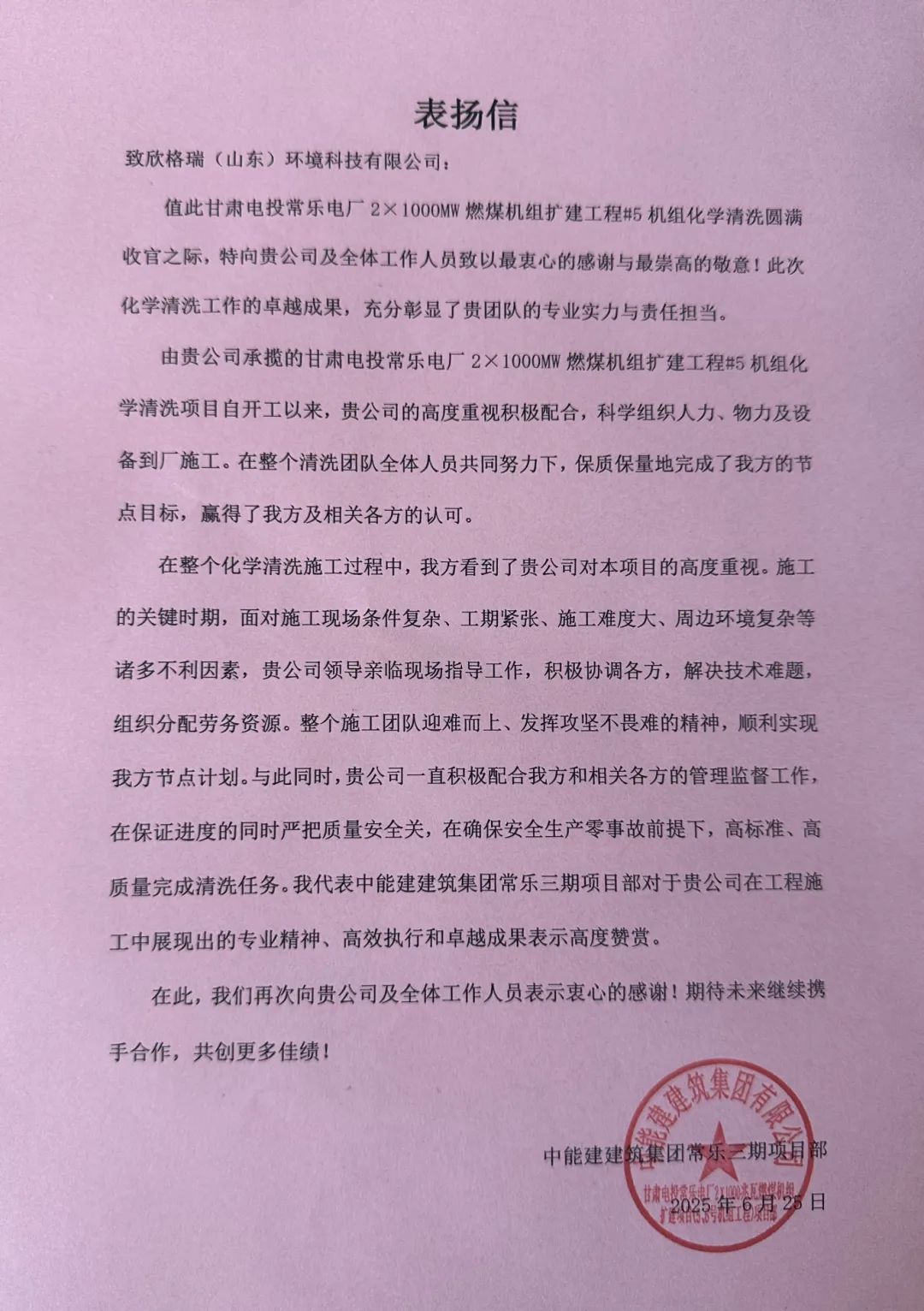 近日,欣格瑞公司收到來自中能建建筑集團常樂三期項目部的表揚信。信中對欣格瑞在甘肅電投常樂電廠2×1000MW燃煤機組擴建工程#5機組化學清洗項目中的卓越表現給予了高度評價。