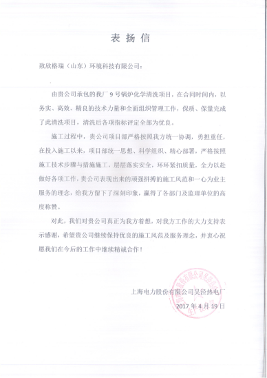 我公司上海吳涇電廠鍋爐酸洗項(xiàng)目收到客戶表揚(yáng)信